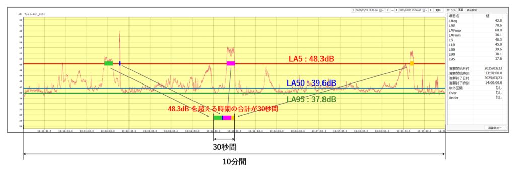 この図の場合、LA5 が 48.3dB であるとは、48.3dB を超えている時間の合計が 30秒間であることを示しています。