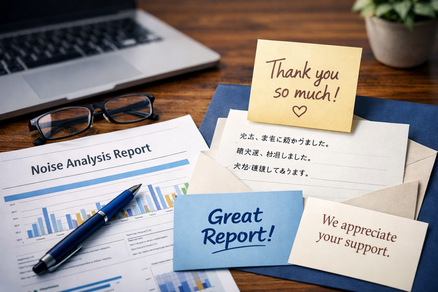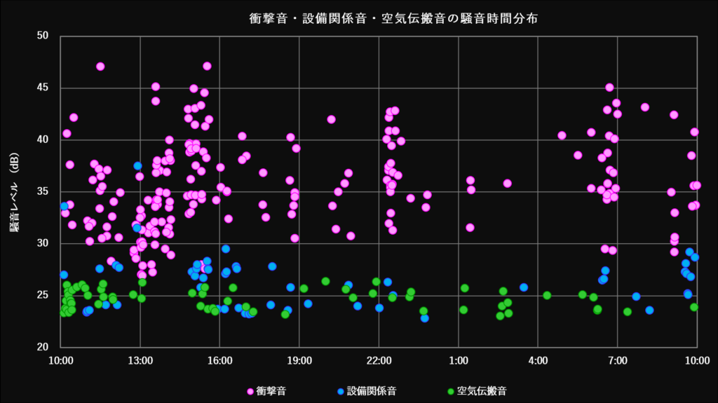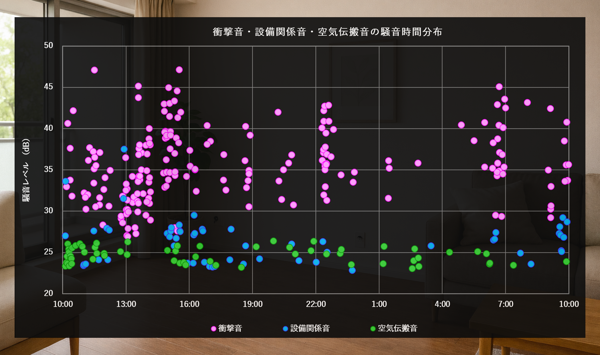 新着記事 2026.01.23 お客様からいただいたお言葉 2026.01.22 お問い合わせ時のよくあるご質問 2026.01.18 騒音の「見える化」 計量証明事業としての確かな測定と、状況に合わせた柔軟な対応により、騒音の被害状況を「見える化」する事が仕事です。 ※記事は随時更新します。 お客様からいただいたお言葉 測定を行っていると、報告書をお届けした後に、思いがけないほど温かいお言葉を頂… ReadMore お問い合わせ時のよくあるご質問 このゴラムでは、お問い合わせ時に皆様からよく頂くご質問についてご紹介いたしま… ReadMore 騒音の「見える化」 騒音測定は、数字を出すだけでは終わりません。どんな音が、いつ、どのくらい起き… ReadMore 騒音測定の流れをご紹介 「測定してもらいたいけど、何から始めたらいいか分からない…」という方も多いの… ReadMore 騒音測定におけるエビデンスとは 「エビデンス(evidence)」とは、証拠や根拠を意味する言葉です。騒音測… ReadMore 騒音問題に実績のある弁護士との連携 騒音問題の解決には、法律の専門知識を持つ弁護士のサポートが欠かせません。 し… ReadMore 野生の生き物たちの鳴き声のレベル 前回は「静けさ」をテーマに、そこから連想される様々な場所の音量を測定した事例… ReadMore 静けさのレベル 「静けさ」や「静寂」という言葉で、どのような場所をイメージしますか?身近な場… ReadMore 距離減衰の考え方 音は距離が増すほど減衰します。 点音源の場合は倍距離 -6dB 線音源の場合… ReadMore いつ発生するか分からない音の測定方法 道路騒音や工場・事業場騒音とは異なり、生活騒音は発生のタイミングや頻度に規則… ReadMore
