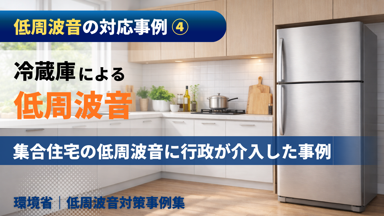 行政が実施した騒音対策事例は、騒音問題解決のヒントとなる貴重な情報源です。本記事では、環境省「低周波音対応事例集」から、一般のご相談でも起こり得る事例を選び、ポイントを絞って解説します。 第4回は、アパートの上下階で発生した低周波音を、行政が公害苦情相談として調査した事例です。音源は「上階の冷蔵庫」。どの家庭にもある家電でも、条件次第で低周波音が問題になり得ることを示しています。 第4回 【事例 26】 冷蔵庫による低周波音 事例の本文は下記のリンクよりご確認できます。 ・低周波音対応事例集(平成20年1 ...