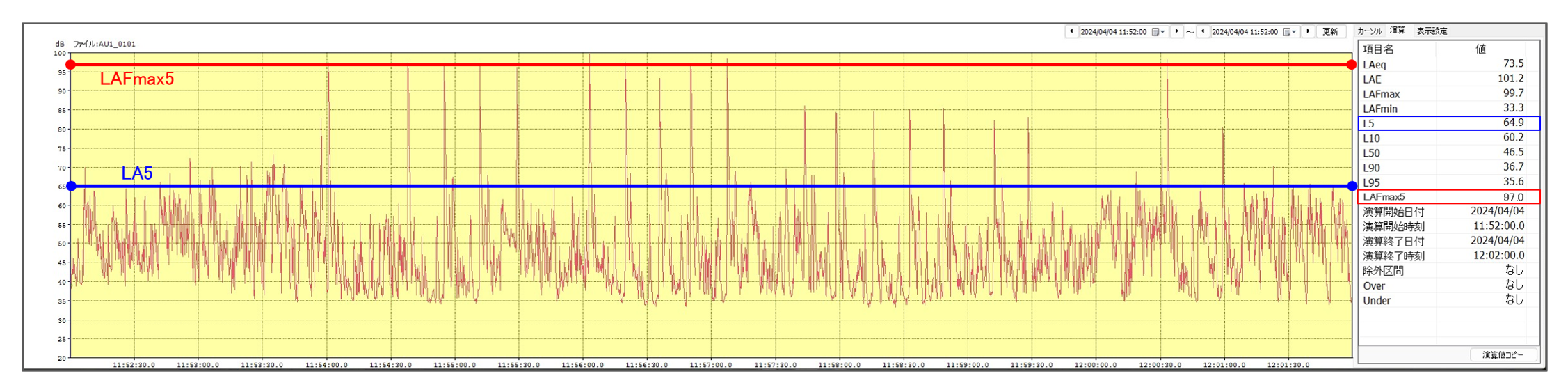 この波形に対し、 LA5 と LAFmax,5 を同時に演算し、図中にそのレベルを示しました。