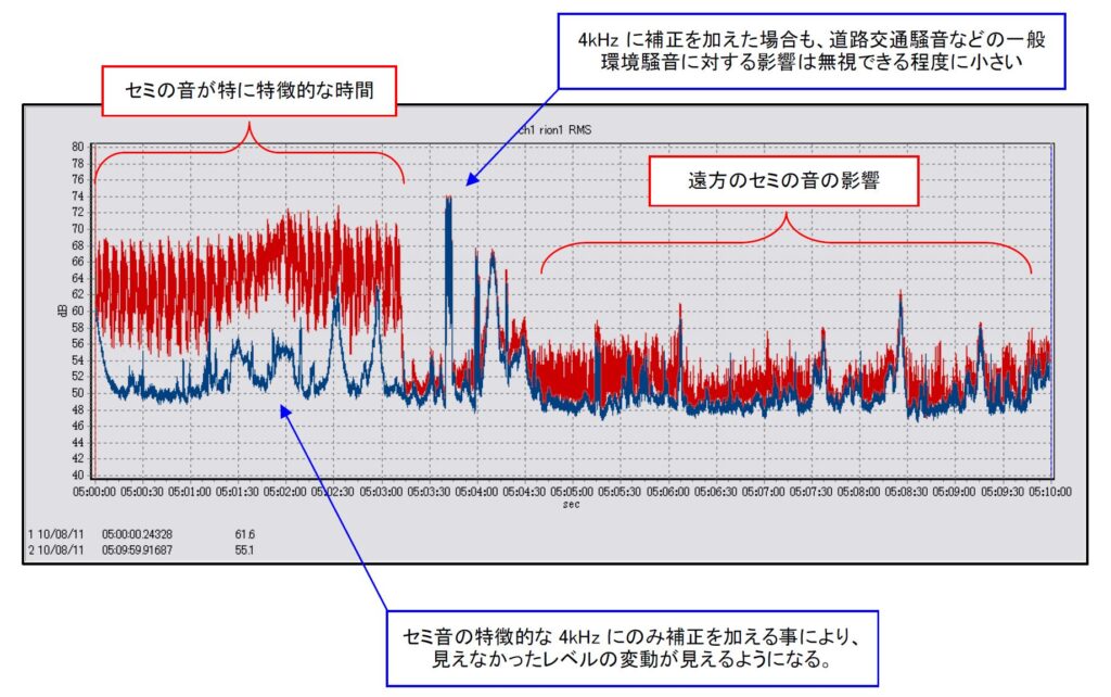 実際に測定したデータをもとに、セミ音の特徴が強く現れていた4kHz帯に補正をかけ、再分析した結果を見てみます。