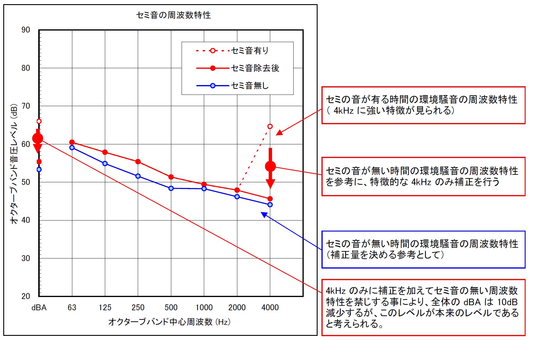 実際に測定したデータをもとに、セミ音の特徴が強く現れていた4kHz帯に補正をかけ、再分析した結果を見てみます。