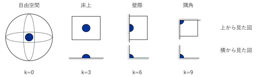 自由空間では音が全方向に広がりますが、床、壁、隅角のように反射面が増えると、音の広がる範囲が限られ、その分だけレベルが高くなります。