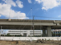 高架高速道路では高架下と騒音環境が全く異なるので、高架下と高架上の両方で同時に測定する事が望ましいと考えます。 特に高速道路の特徴として夜間は交通量が少なくなる代わりに通過速度が上昇する傾向があり、深夜においても日中と変わらないレベルが発生する場合があります。 高架高速道路の高さは20m以上の場合が多いのですが、画像のように12m以下となる場合は高所測定用ポールを利用した測定が可能です。